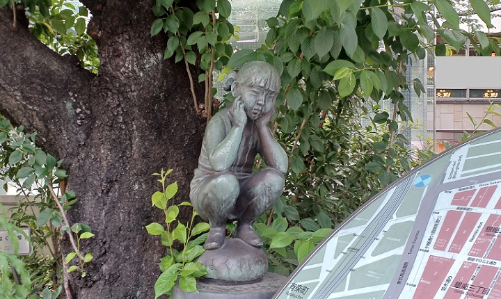何とも寂しげ!? 交番横で座り込む彫刻「はぐれっこ」